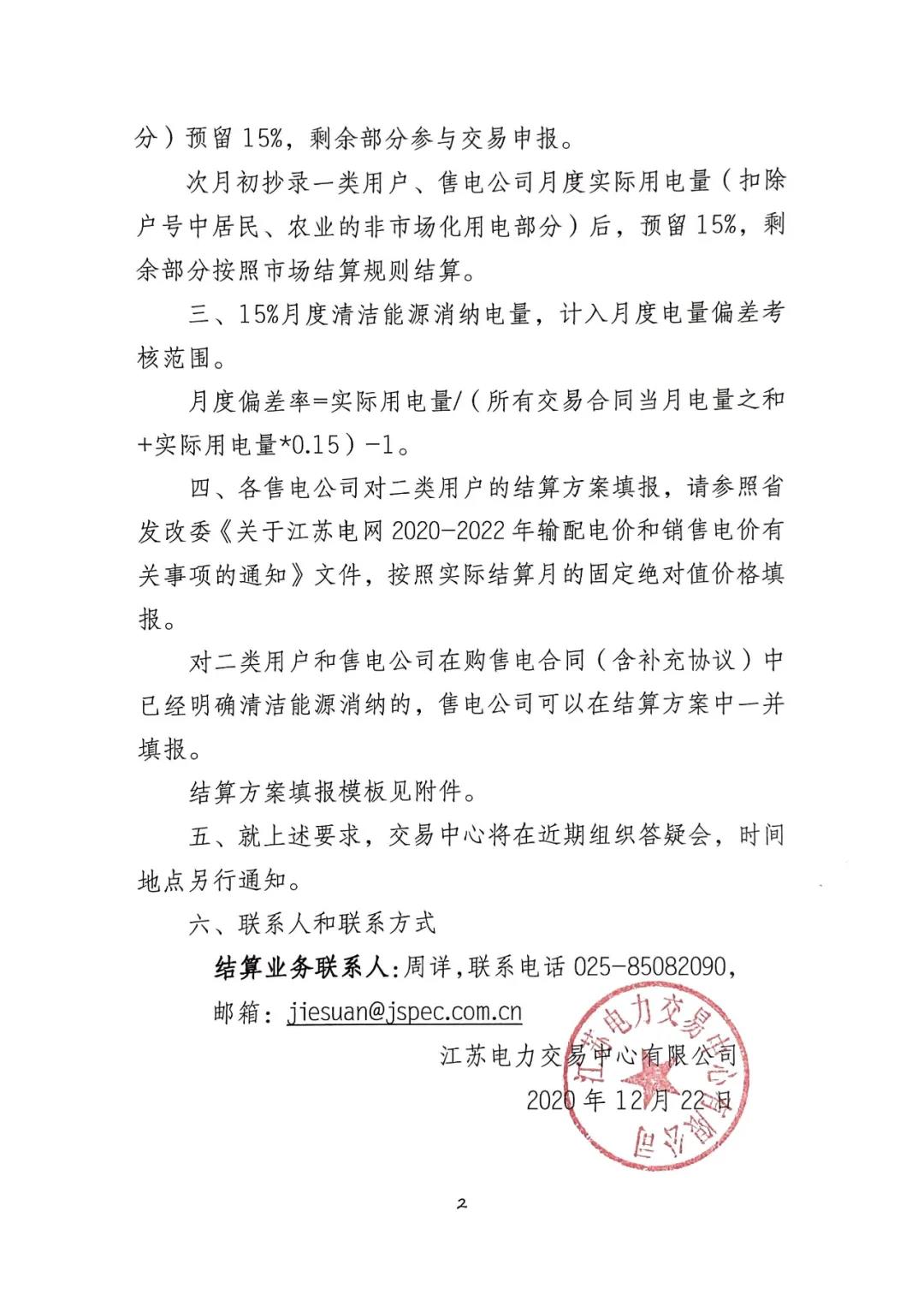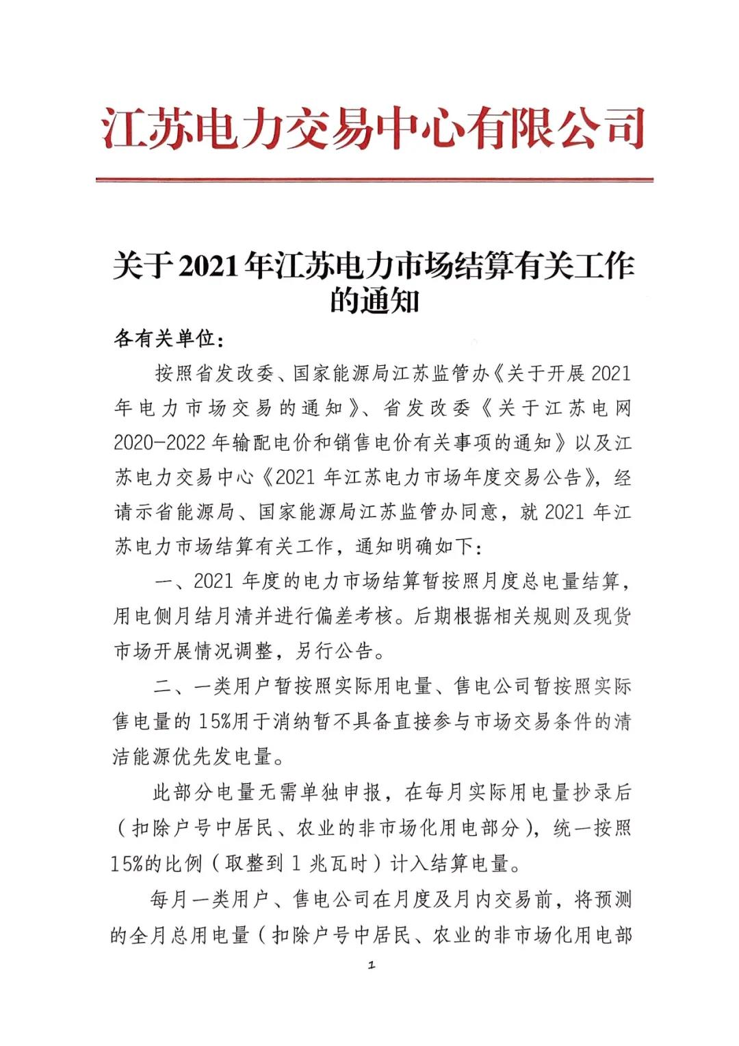 江苏电力交易中心日前发布了《关于2021年江苏电力市场结算有关工作的通知》,2021年度的电力市场结算暂按照月度总电量结算,用电侧月结月清并进行偏差考核。一类用户暂按照实际用电量、售电公司暂按照实际售电量的15%用于消纳暂不具备直接参与的市场交易条件的清洁能源优先发电量。